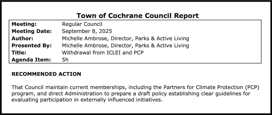 After a slight detour to hear the opinion of the Natural Environment task force, at its September 8, 2025 Regular Council meeting, Council decided, by a vote of 5 to 2, to support Administration’s motion not to remove the Town from membership in the Partners for Climate Protection (PCP) program, thereby sending a message that the Town of Cochrane is committed to meeting the PCP’s objective of taking “action against climate change by reducing emissions” in the community in order to meet the UN/ICLEI’s objective of “an absolute net-zero emission level at the latest by 2050”.