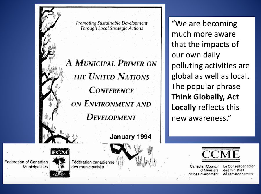 In 1994, the Federation of Canadian Municipalities (FCM) sent a 40-page “Municipal Primer”, essentially an instruction manual, to the municipalities across Canada. You can see within that document an early appreciation of the importance of local action to achieve global aims: