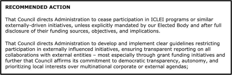 Early in the morning prior to the council meeting on June 23, 2025, Braun sent an email, Ahead of Today’s Vote – Clarifying the PCP Program and ICLEI Participation, wherein she provided information about the character of ICLEI as a UN-founded, corporate-funded NGO (non-government organization), gave A recent example from Lethbridge, AB to illustrates the hidden cost of the PCP program, and encouraged “all members of Council to vote in support of this motion on Monday. You have the opportunity to set a national example for principled, informed leadership”.